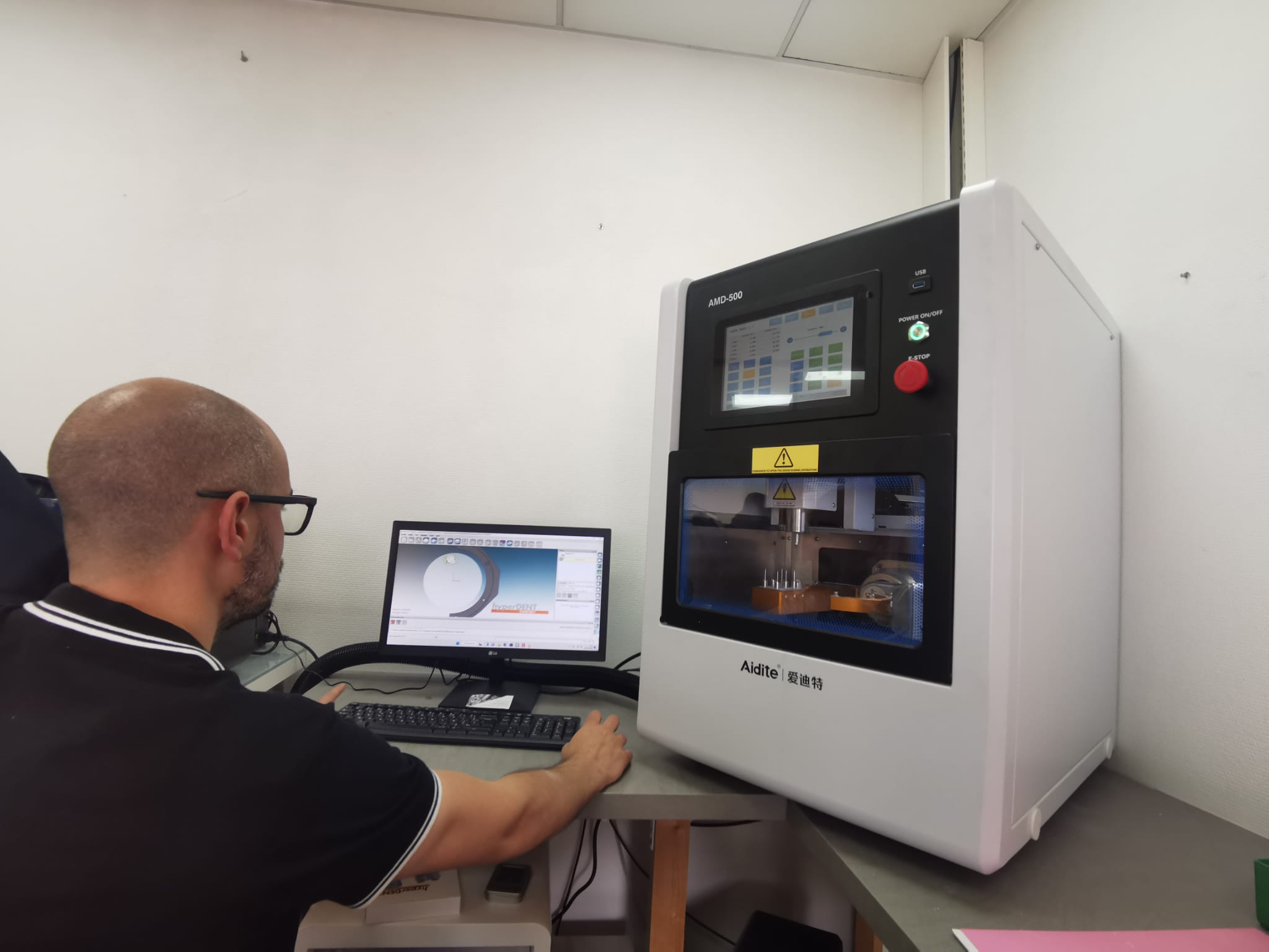 Antony, en train de paramétrer le logiciel HYPERDENT pendant une installation d’usineuse de la marque AIDITE à Saint Lô.